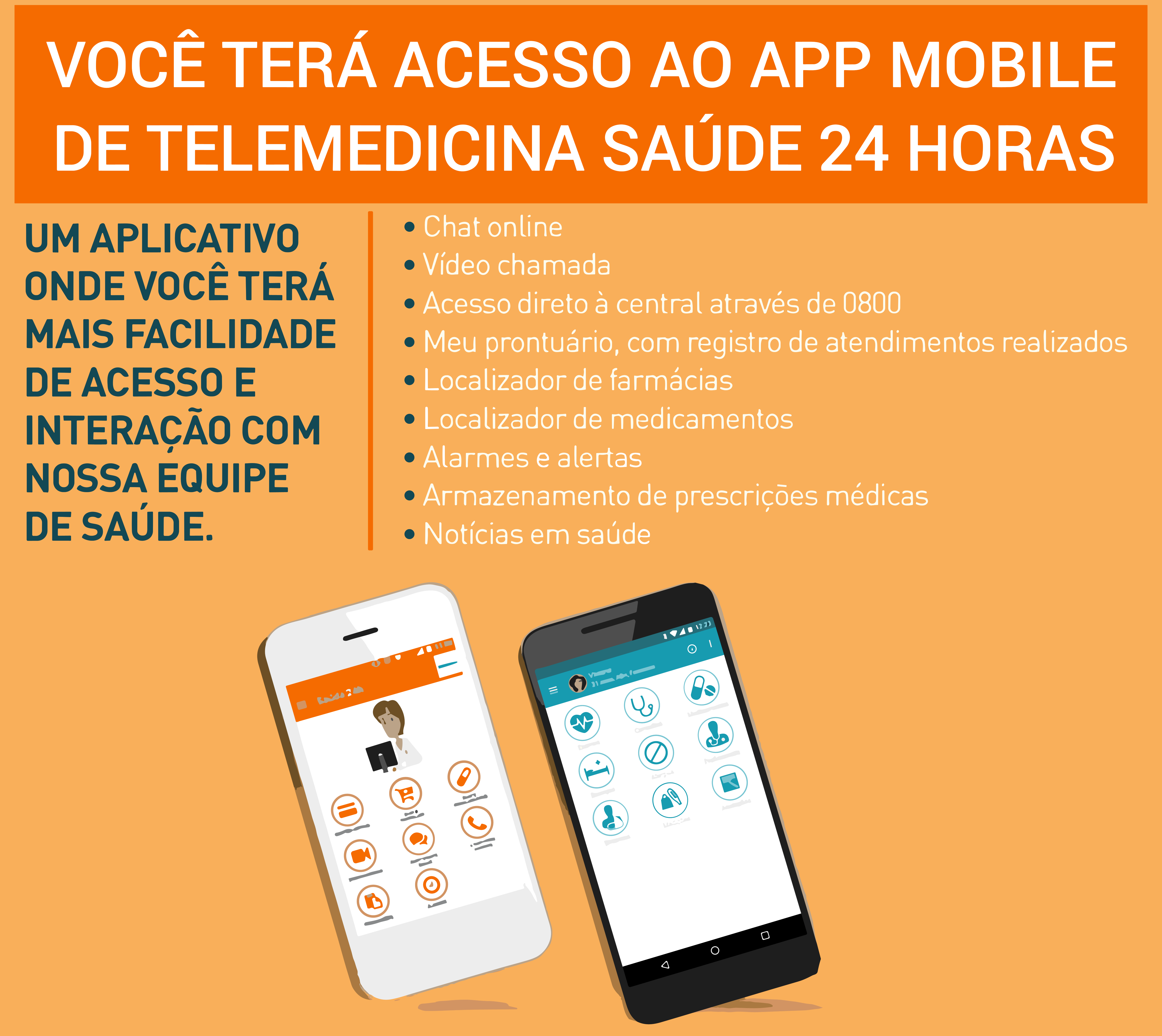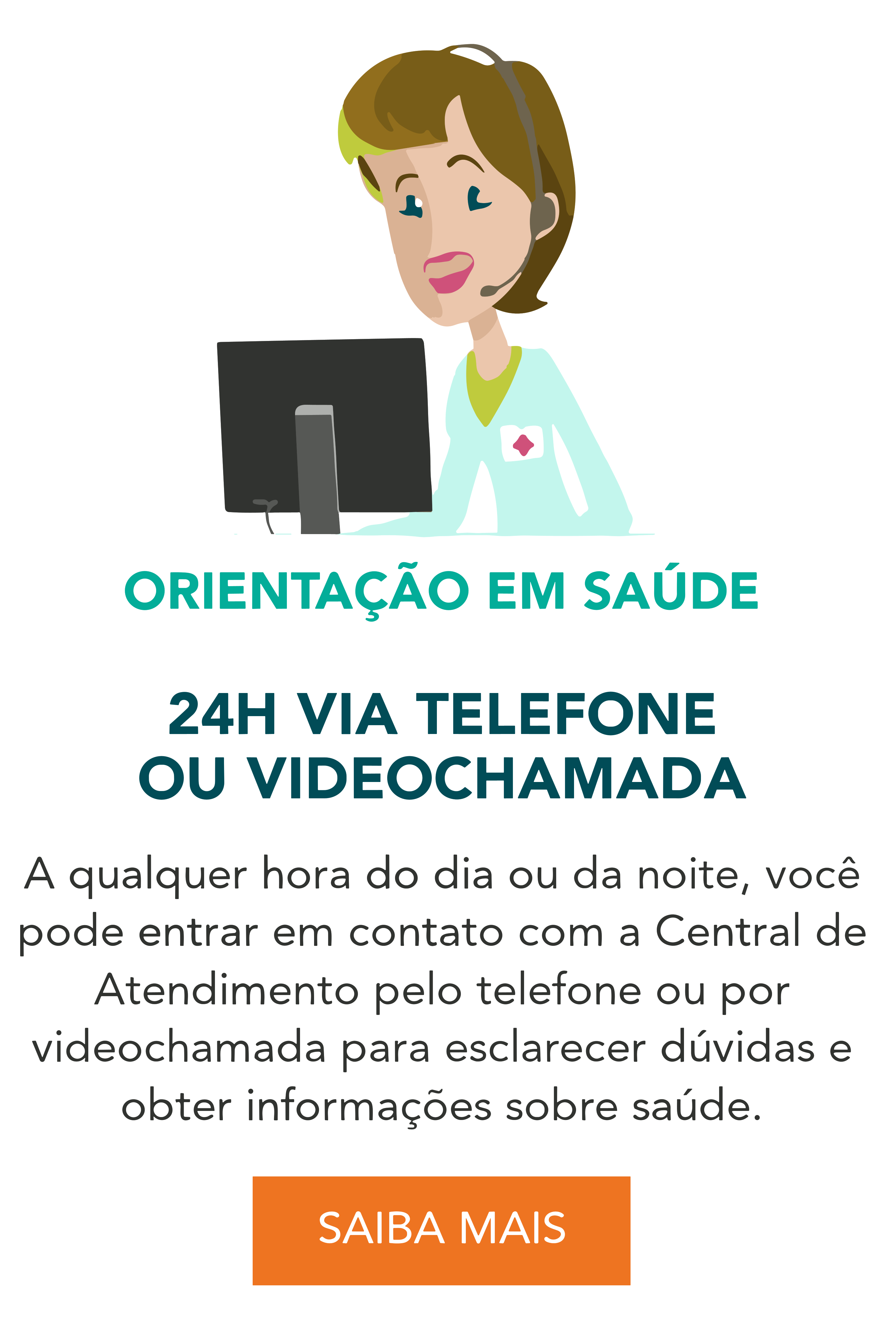 Nosso serviço de Telemedicina de Saúde 24h é um serviço de orientação e informação em saúde por telefone ou videochamada, que funciona 24 horas por dia e ainda oferece benefícios exclusivos como desconto em diversos medicamentos.